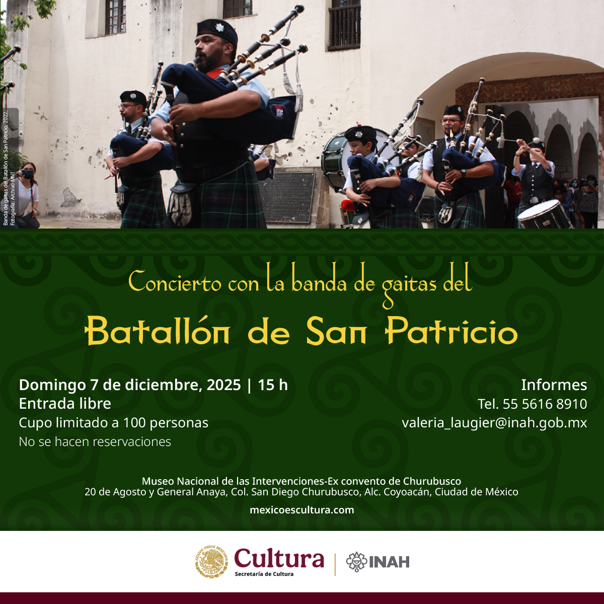 La Banda de gaitas del Batallón de San Patricio y Dance Corps te esperan cada primer domingo del mes a las 15 horas para que nos acopañes al Tattoo de Churubusco, una presentación de danza y música irlandesa y escocesa.